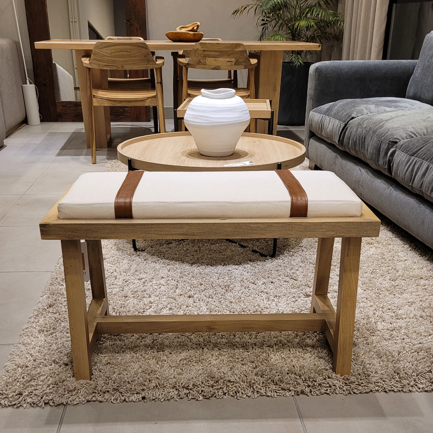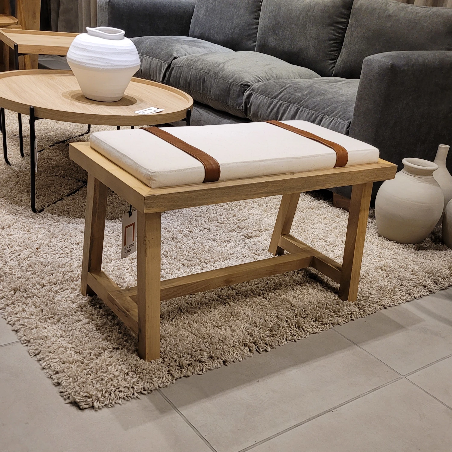 Banqueta De Madera Loro Blanco Tapizada En Panamá Natural Con Detalles En Cuero Amalfi Walnut