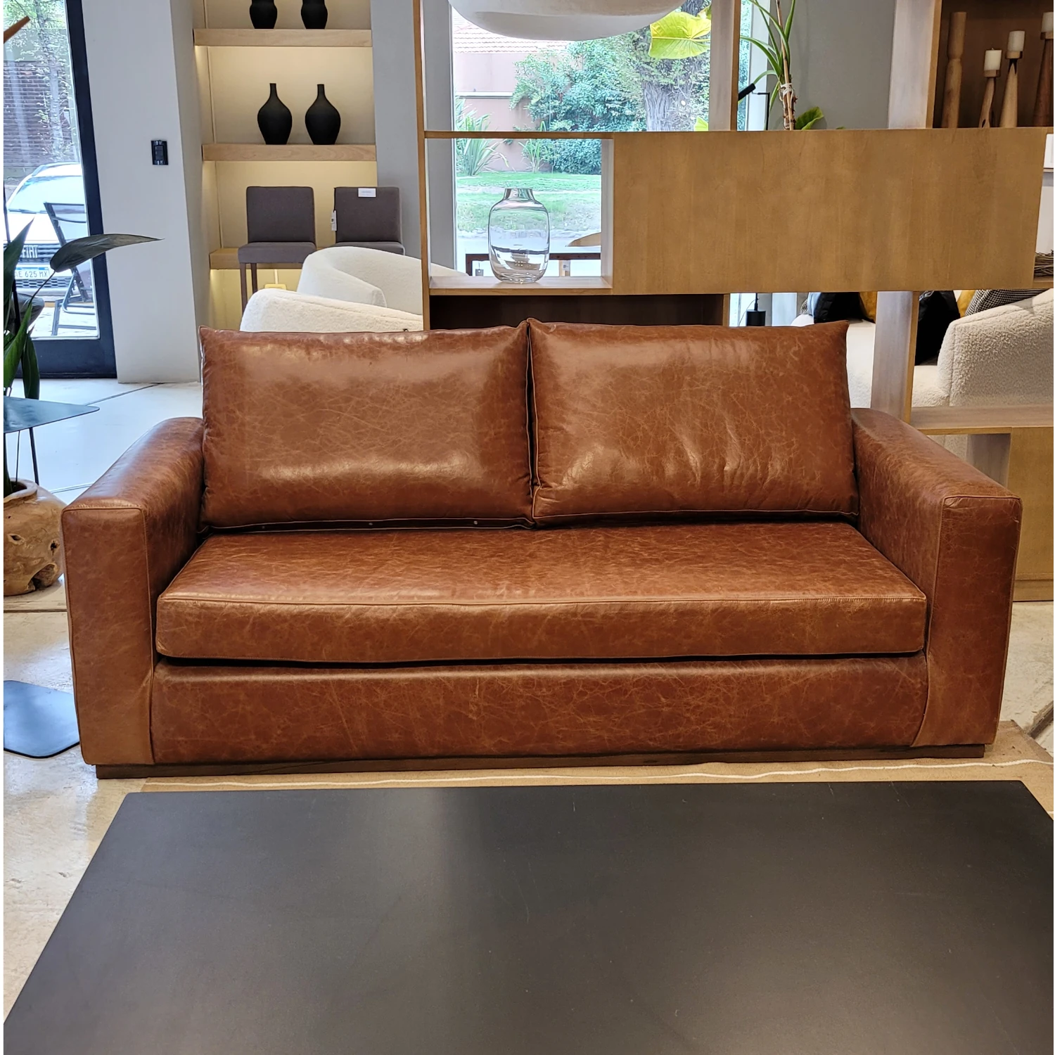 Sofá De 2,5 Cuerpos Tapizado En Cuero Amalfi Walnut Con Zócalo De Madera Maciza